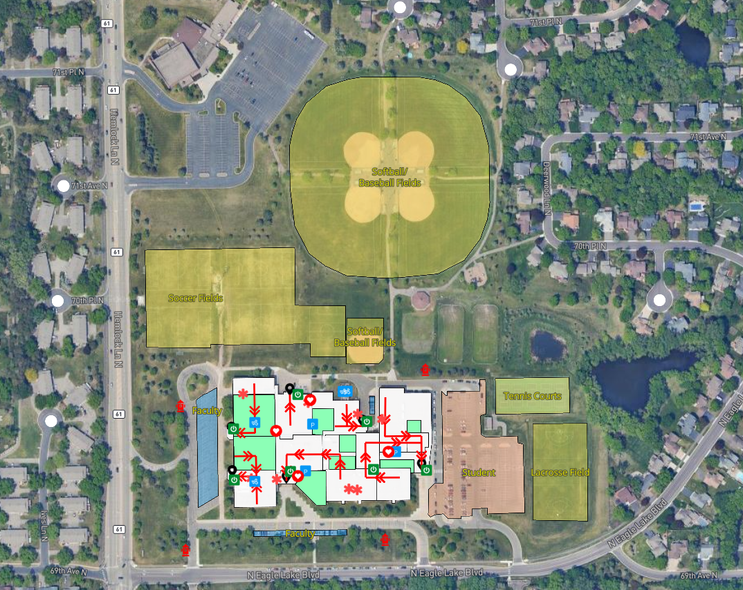 Easily locate evacuation routes, 911 call locations, AEDs, security cameras, alarms and more